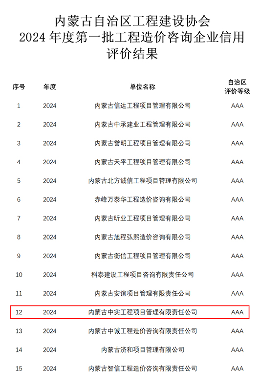 2024-07-3017025 次近期,我公司参加内蒙古自治区工程建设协会组织的“2024年度第一批工程造价咨询企业信用”申报,获得“信用AAA级证书”。我公司成立多年以来,遵循中国工程造价管理协会对造价咨询企…